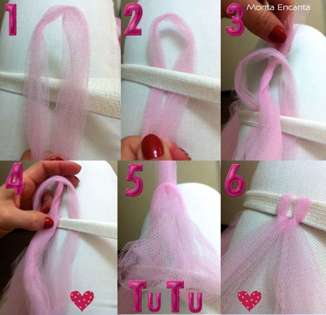 Dobre uma tira de tule, cortada, ao meio. Coloque a tira dobrada, atrás do elástico. E vá fazendo os nós. Eu montei na perna, enquanto assistia TV no quarto. Retirei o elástico da almofada. Coloquei sobre uma perna, vestindo-a e fui dando os nós