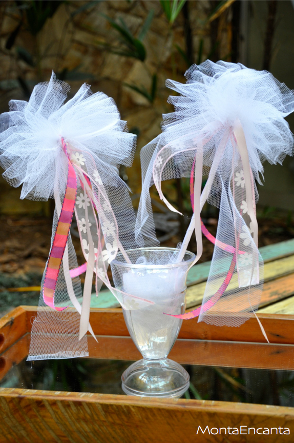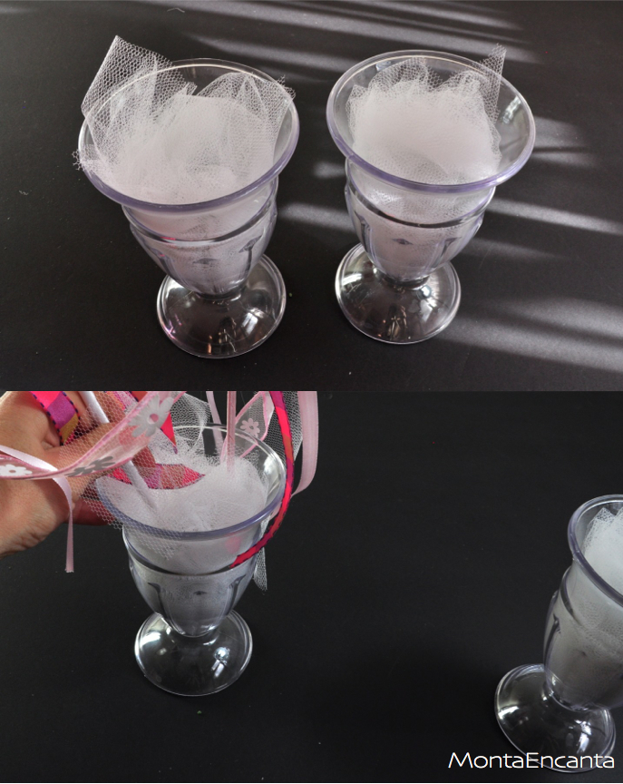 - Agora é só montar, colando com cola quente e colocando as fitas e as tiras de tule para enfeitar
