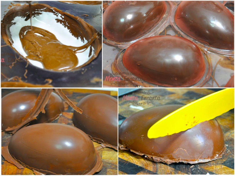 - 1 barra de 1k de chocolate ao leite, ou chocolate meio amargo ou chocolate branco temperado. Cada kilo de chocolate rende aproximadamente 4 ovos de 250g cada.