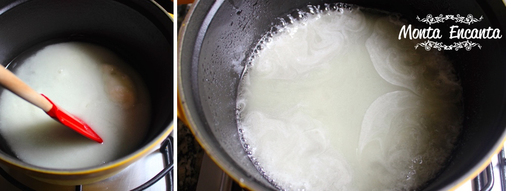 Após mais ou menos 15 minutos, a calda transparente, atinge ponto de ‘xarope’ grosso, ponto de fio.
