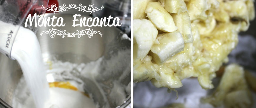 - 2 xícaras de açúcar, as 5 bananas amassadas, ½ xícara de óleo ou 1/2 xícara de manteiga derretida no micro por 1min.