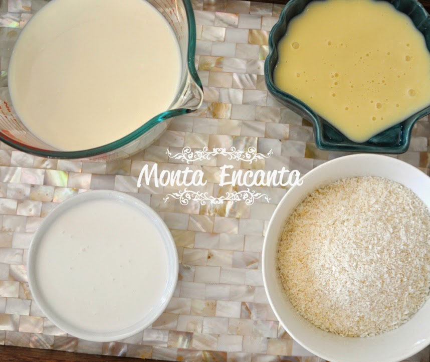- Junte 200 ml de leite condensado + 200 ml de leite + 200 ml de leite de coco