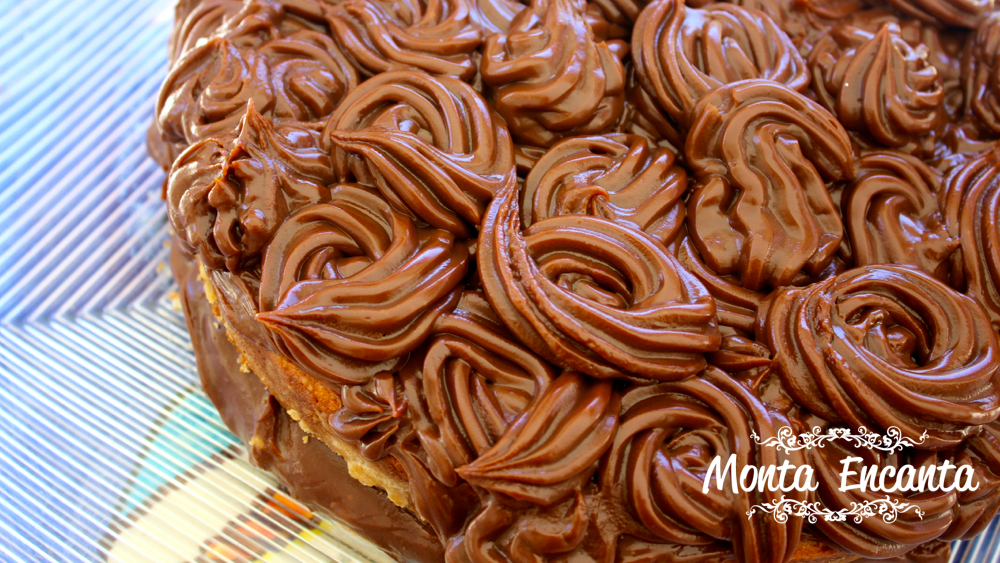 Depois é só cortar a massa em camadas, preparar um delicioso Brigadeiro Gourmet, rechear e cobrir, com ajuda do saco de confeiteiro fazendo rosas.