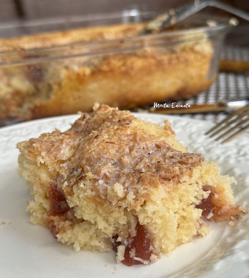 Bolo de Romeu e Julieta é indescritivel, então prepare-se para experimentar o bolo mais fofinho e delicioso que você já provou! Com a dupla clássica de goiabada e queijo, além de coco queimado e uma calda irresistível de leite condensado, essa maravilha vai te surpreender! O sabor lembra um bolo de queijadinha, porém mais fofinho, com deliciosos quadradinhos de goiabada, hummm… é bom demais!