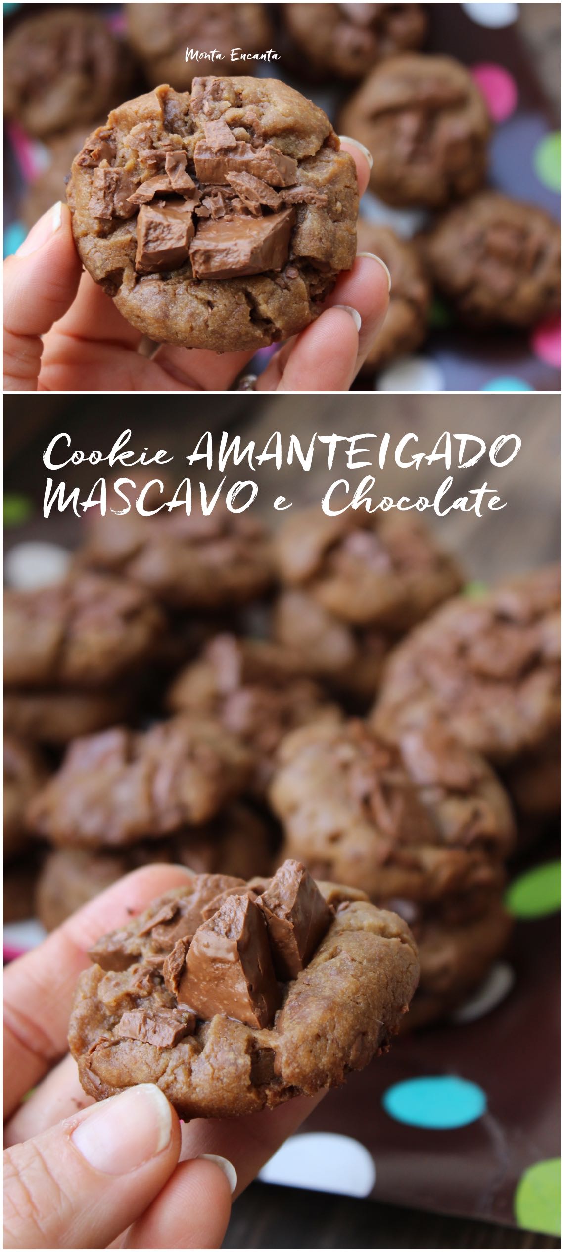 Cookie Amanteigado que derrete na boca. Leva açúcar mascavo o que lhe confere uma cor mais escura e chocolate ao leite em barra picado. Tão gostoso e tão simples de fazer que até criança faz brincando!