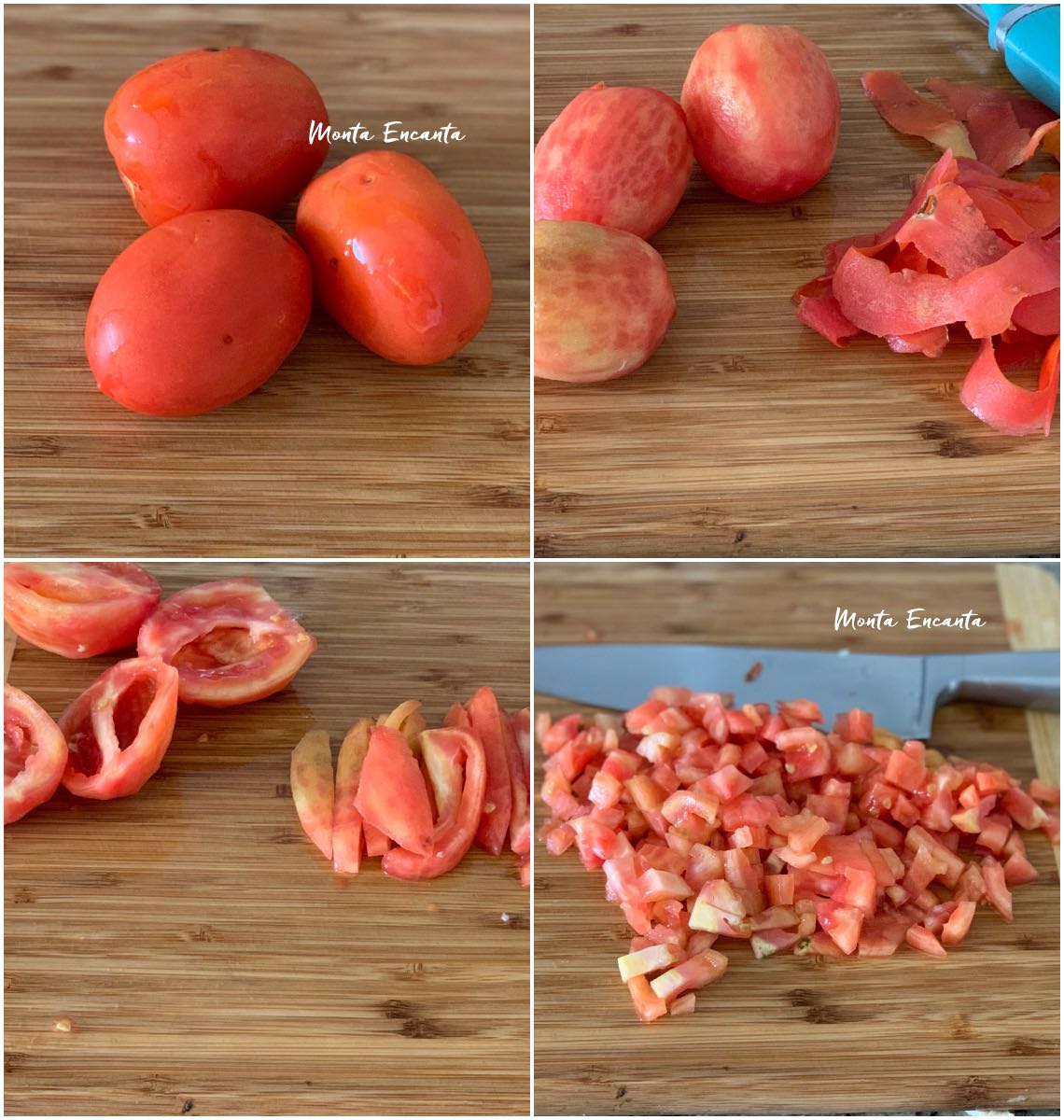 Depois  retire a pele do tomate (usei um descascador de legumes) e retire  as sementes (opcional).  Então  corte os tomates ao meio e  no sentido do comprimento corte em fatias, logo depois  corte as fatias em cubos pequenos e reserve. (veja a foto)
