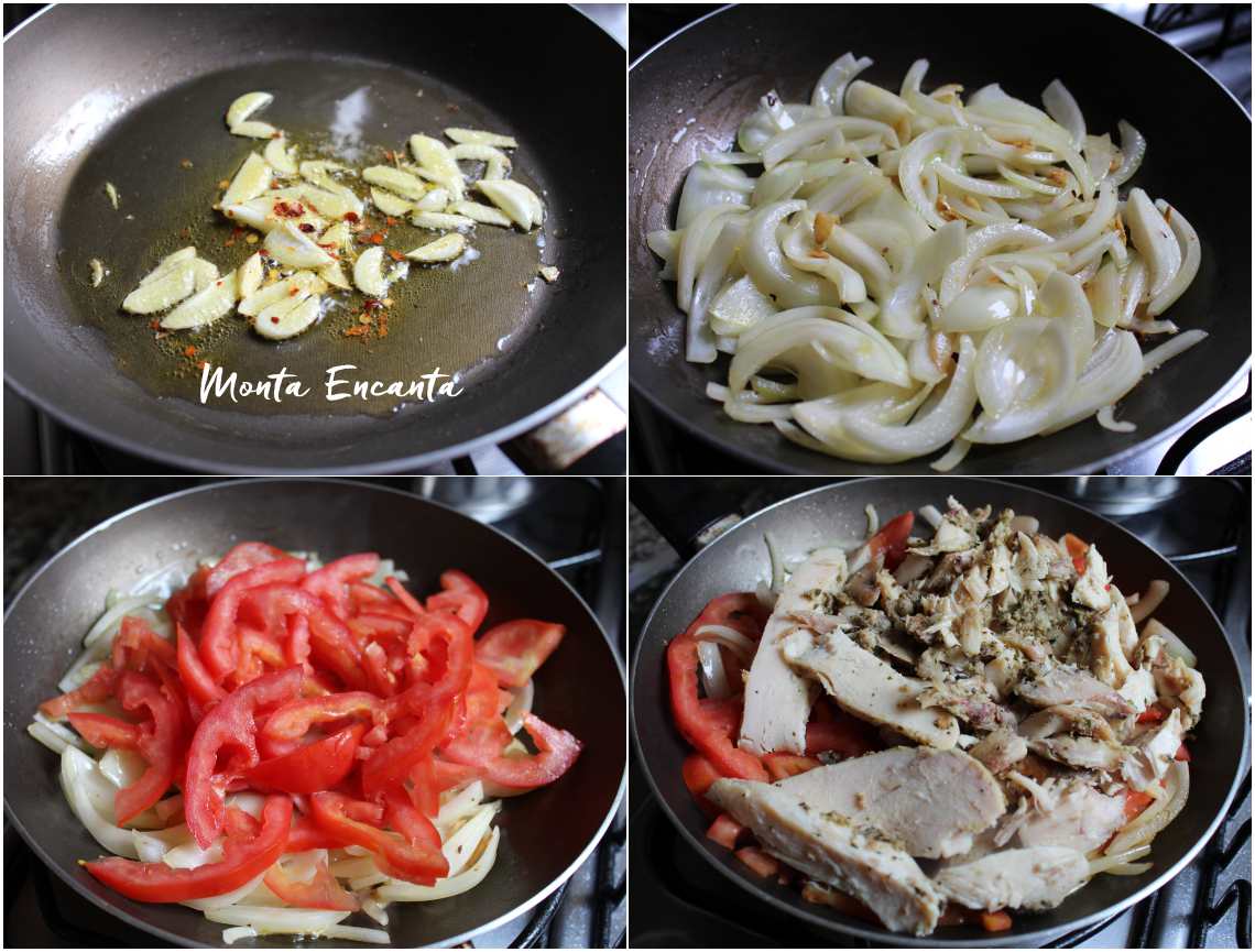 - Junte a cebola fatiada em meia lua, deixe refogar por mais 2 minutos ou até que fiquem translúcidas.