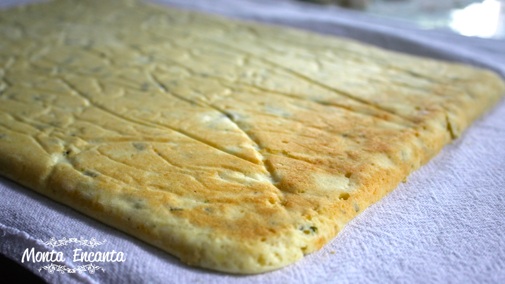 Misture 2 colheres de sopa de cebolinha verde picada e espalhe a massa numa forma retangular sob papel manteiga (45x30x2)