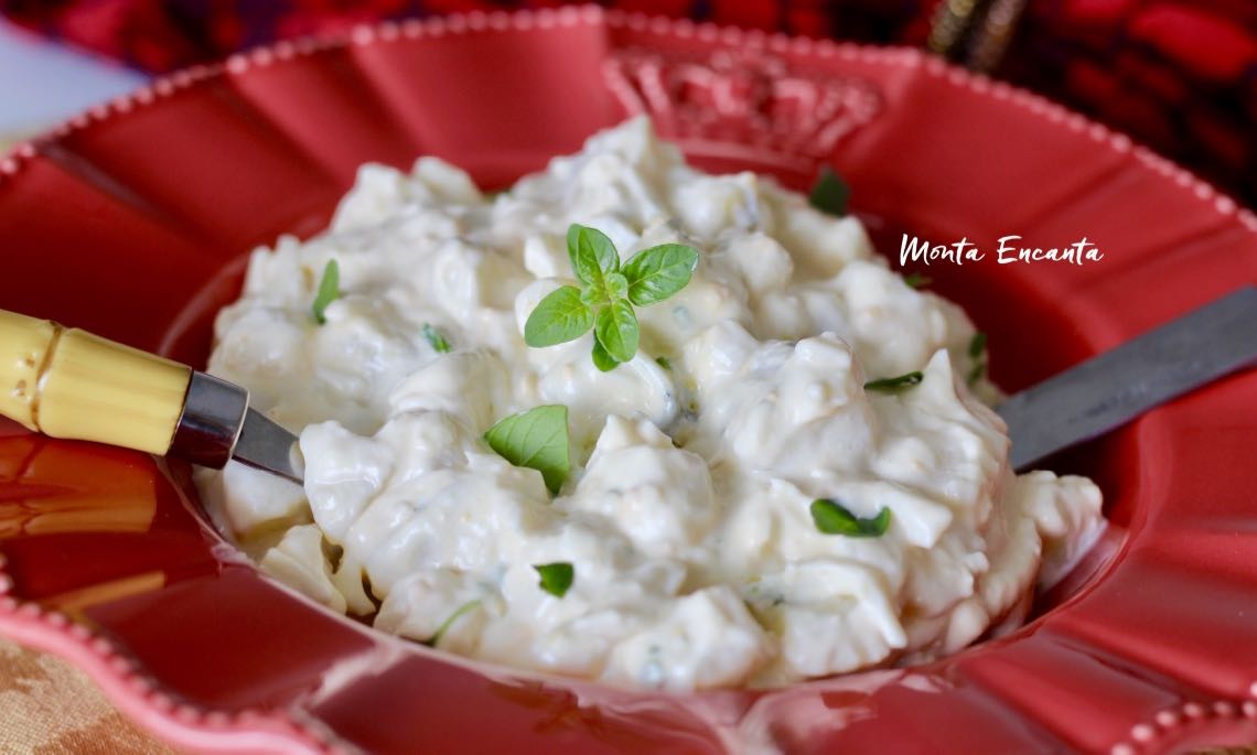 Salada de ovo com batata e maionese é uma das receitas mais tradicionais. Para incrementar o sabor, a maionese é caseira e de alho e os ovos cozidos entram ralados e temperados com azeite sal negro, pimenta do reino e salsinha.