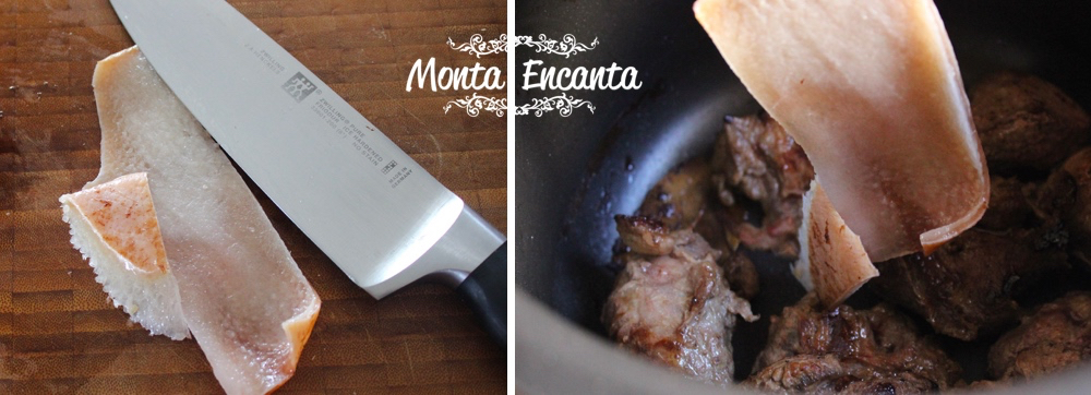 Com a carne de ambos os lados cozida e dourada, acrescente a pele do bacon que depois será retirada