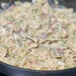Em seguida acrescente 250g de macarrão, acerte o sal e pimenta do reino a gosto coloque 1 xícara de chá de água fervente e deixe cozinhar pelo tempo indicado na embalagem. A água entra aos poucos, como se estivéssemos fazendo um risoto, uma xícara de água por vez. Então colocamos a água, quando ela secar, entramos com mais água ( mais uma xícara) até que a massa esteja cozida e ‘al dente’