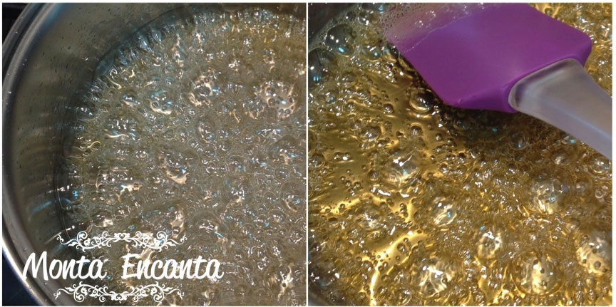 Prepare a calda, colocando o açúcar e a água em uma panela, leve ao fogo, dissolva o açúcar e não mexa mais, e deixe no fogo até ficar dourada, não descuide.