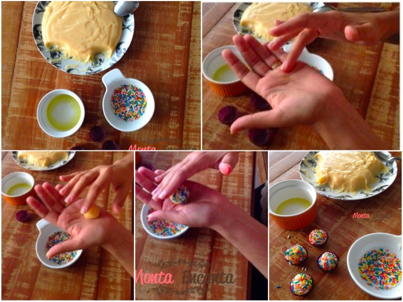 - Faça as bolinhas e passe no confeito (de boa qualidade) volte para mão e enrole novamente.