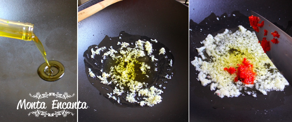 - Em uma frigideira, fogo médio, coloque 1-2 colher de sopa de azeite, os 4 dentes de alhos amassados e descascados. Deixe alourar por 1-2 minutos e então junte 1/2 pimenta dedo de moça picadinha e sem as sementes. Deixe por mais 1-2 minutos.