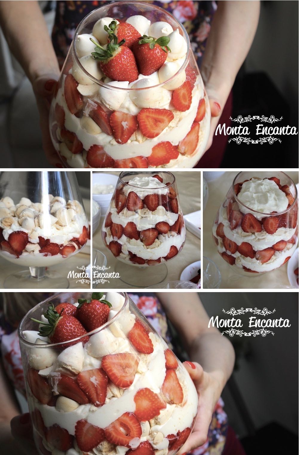 - A montagem é simples: uma camada de chantilly, uma camada de suspiro e uma camada de morangos fatiados!