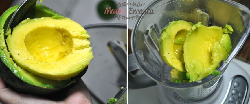 Abra o abacate ao meio, retire a maior parte da parte amarelinha, sem colocar a parte verde escura do abacate senão amarga.