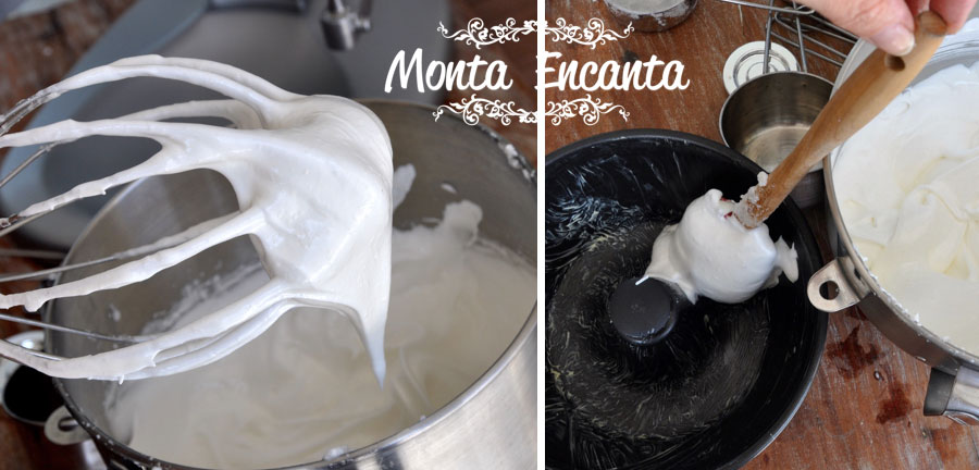 Bata por mais 10 minutos, até formar um lindo merengue brilhante e firme. Para variar no sabor, pode-se acrescentar raspas de 1 limão tahiti, mas aí para cobrir prefira a calda de caramelo ou calda de gemas. No final do post tem a receitinha da calda de gemas. 😉- Coloque um pouco das claras em neve na forma untada e espalhe com ajuda de uma espátula.