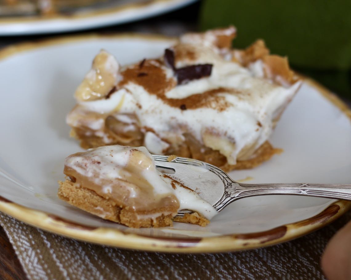 Banoffe de banana, torta com base de bolacha triturada e manteiga, recheio de doce de leite com banana fresca e coberura de chantilly com canela em pó e ou chocolate em pó.