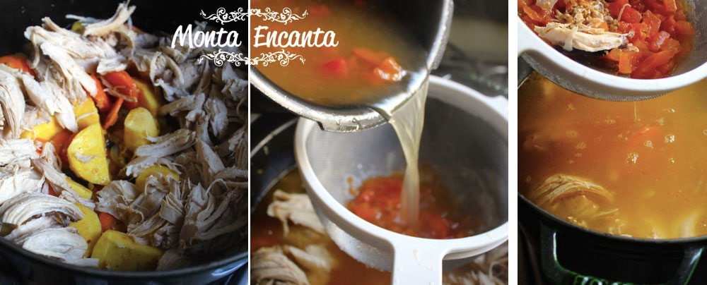 Junte ao caldo coado com ajuda de um coador grande, ao ‘sofrito’, o refogado de alho e cebola com os legumes.