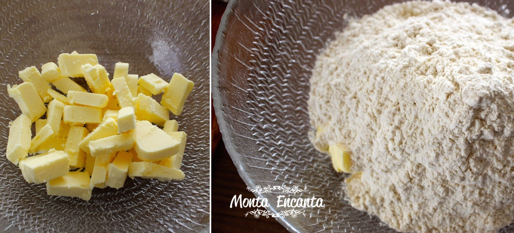 Em um bowl médio, coloque 200g de manteiga cortada em cubos e bem gelada. Junte 360g de farinha de trigo